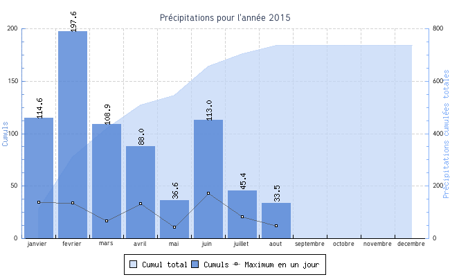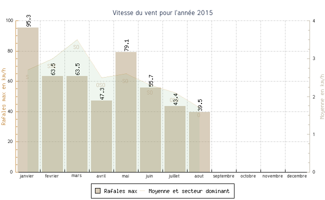 | avril | 0.8 °C | 7.3 °C | 29.2 °C | 20.2 °C | 13.6 °C | 2.5 km/h | 47.3 km/h | OSO |